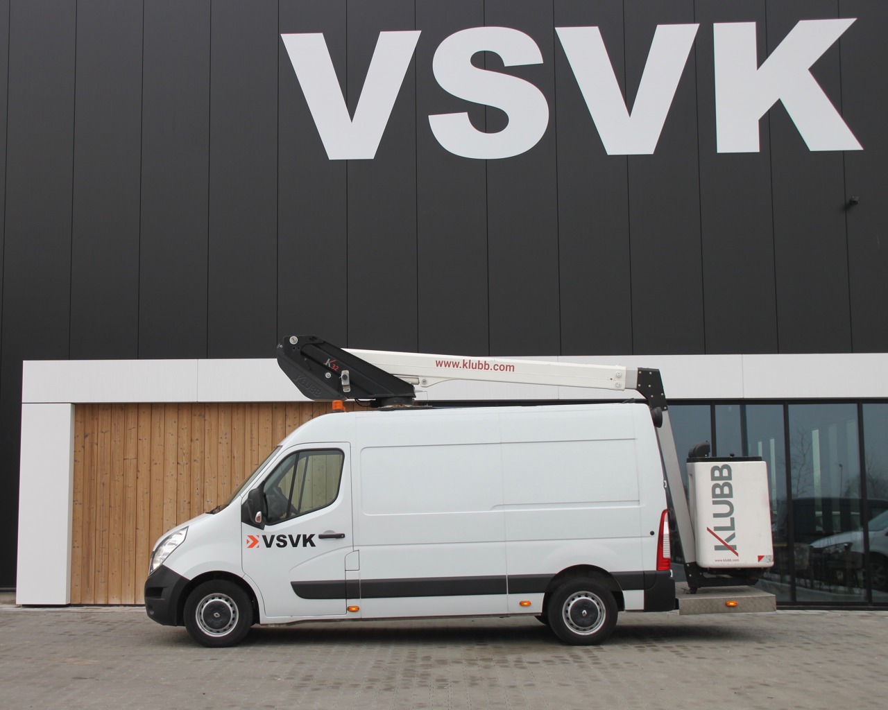 Ontdek de KLUBB K38P Hoogwerker op opengewerkte bestelwagen. Met dit model kunt u een werkhoogte van 13,8 m en een offset van 8,2 m bereiken.
